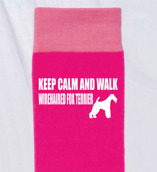 Keep Calm & Walk Wirefox Terrier Ladies Novelty Socks Pink Dog Lovers Gift