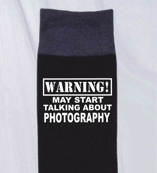 Warning May Talk About Photography Men's Black Novelty Socks Birthday Gift