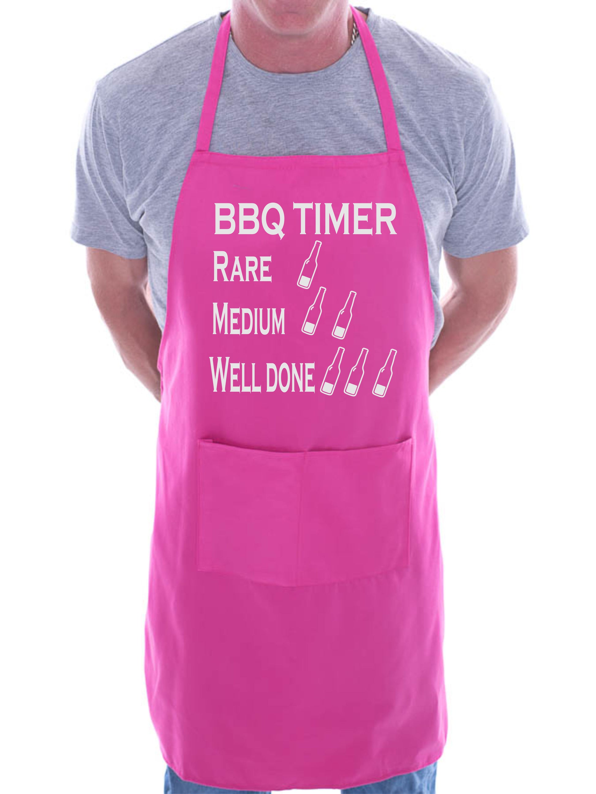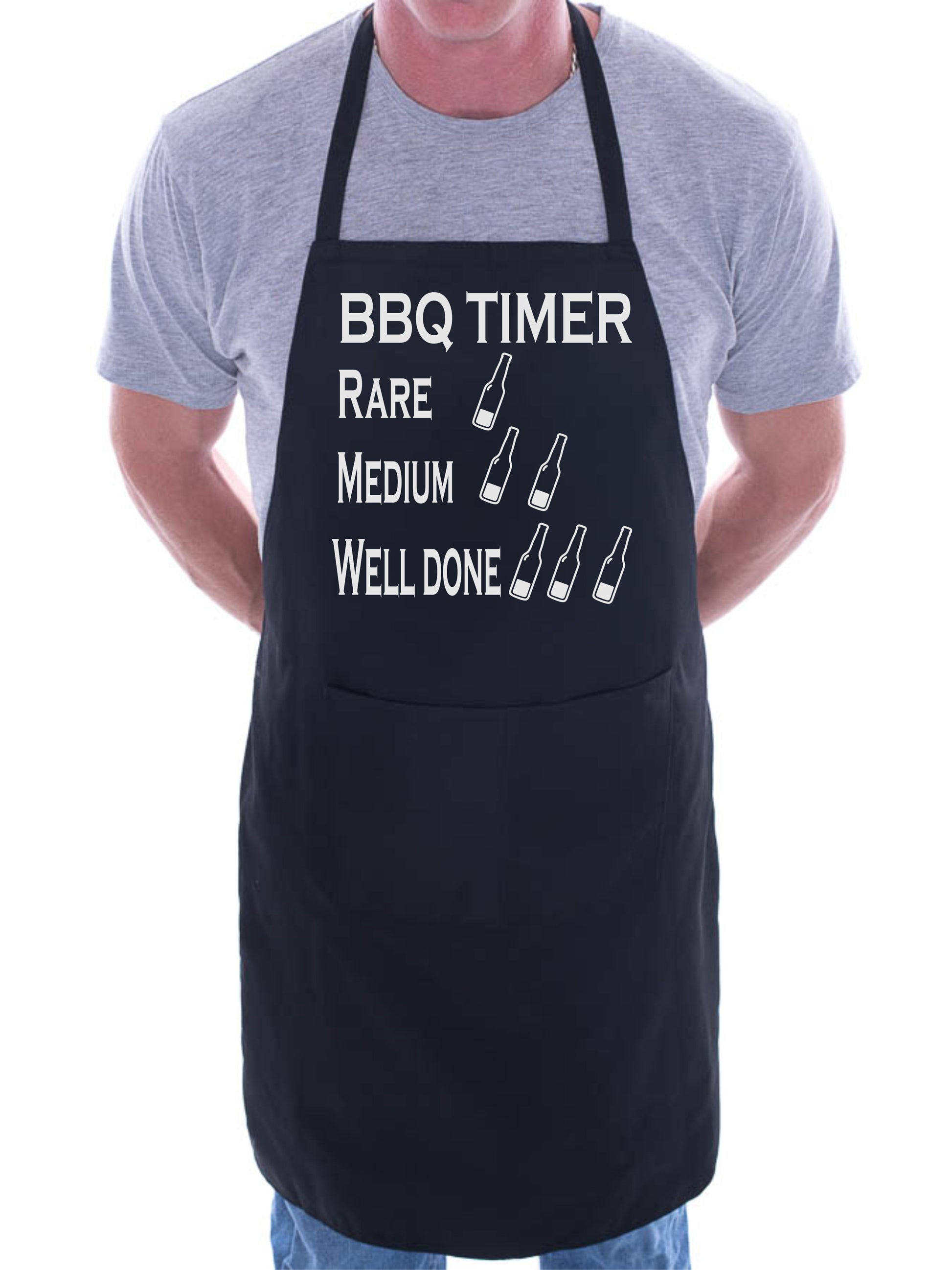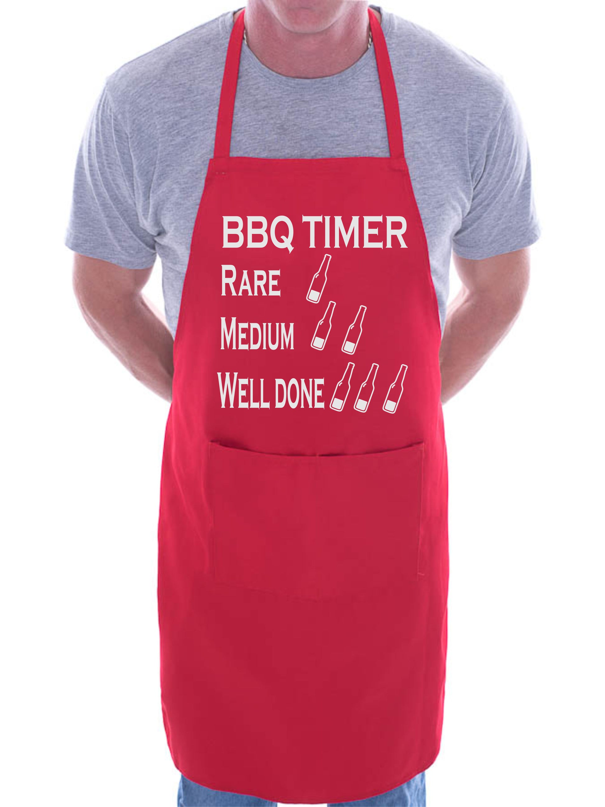 - ONE SIZE BBQ KITCHEN APRON:- The aprons measure 23 inches in width and 33 inches top to bottom. All our novelty aprons have with ties at the back and a wide neck loop and are knee length on the average height adult. There is a very useful double pocket on the front which is great for keeping cooking utensils to hand